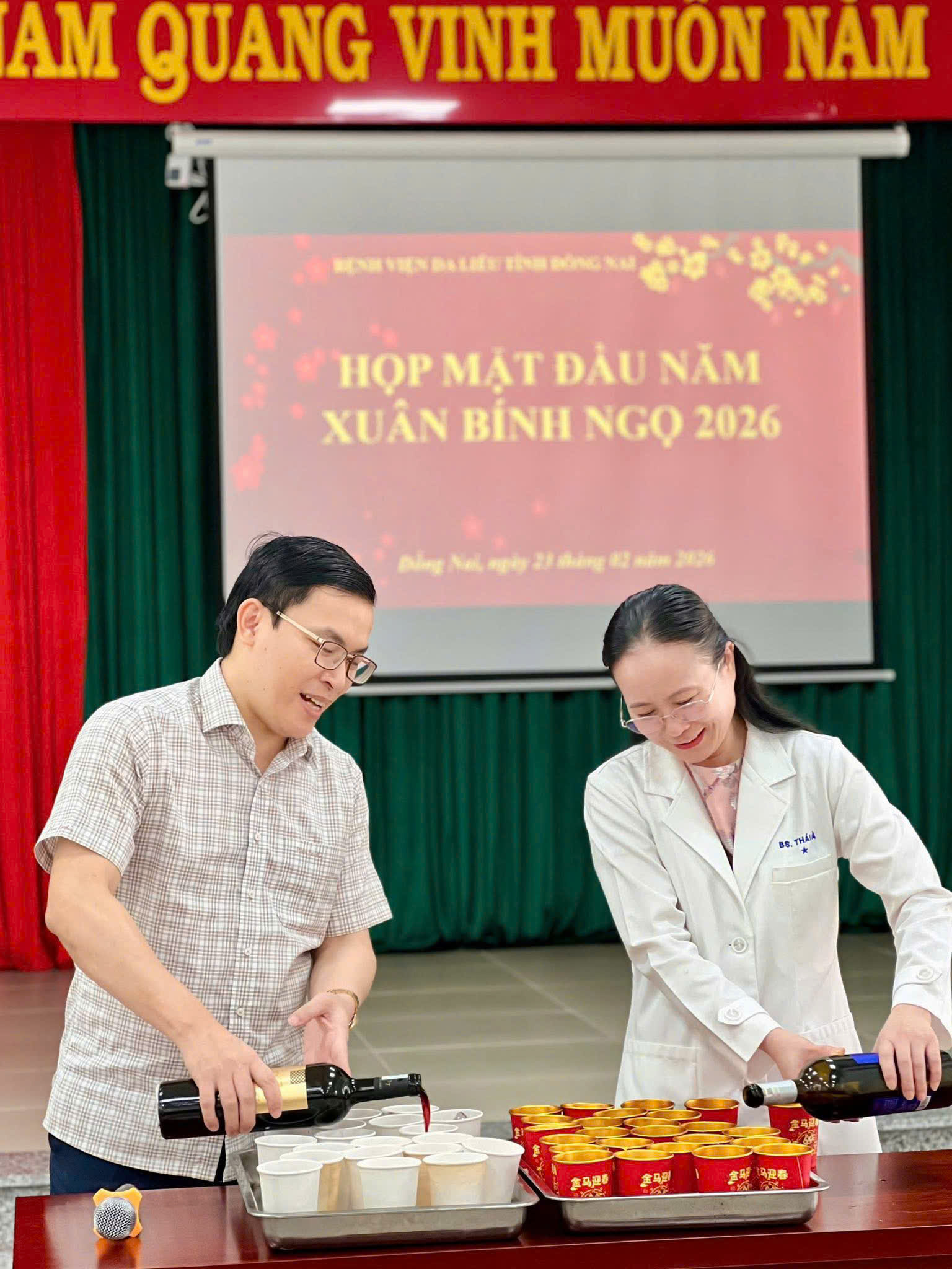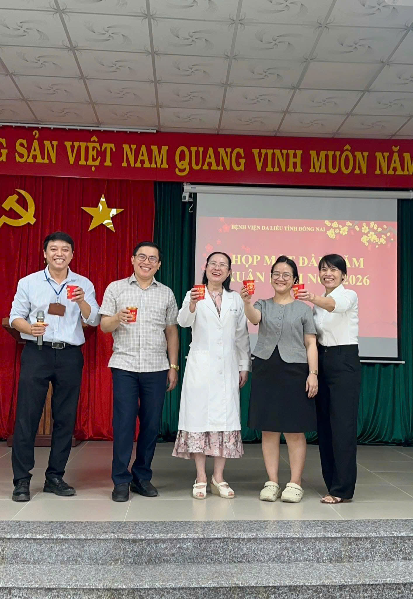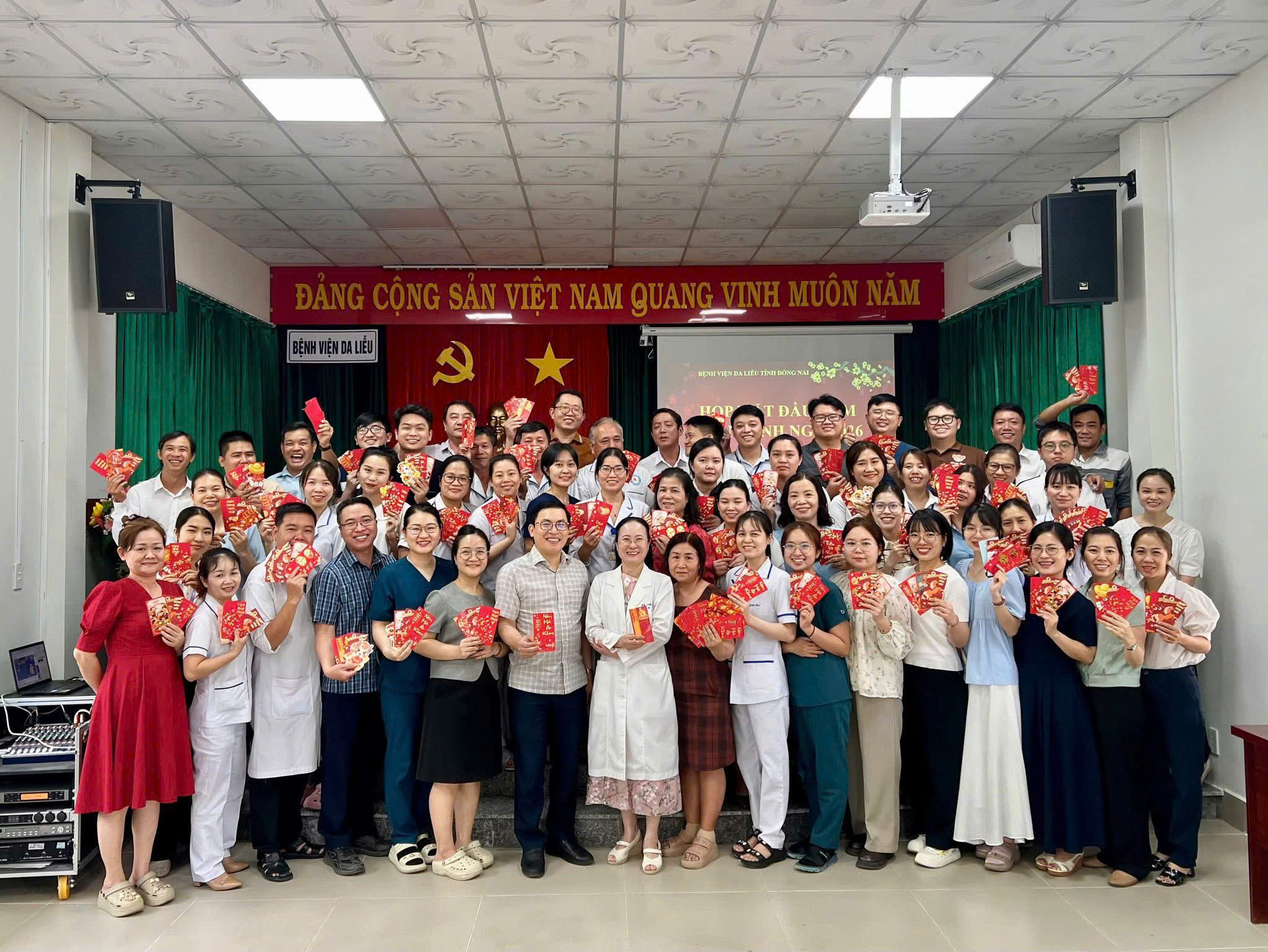 Hôm nay, ngày 23/02/2026 (tức Mùng 7 tháng Giêng năm Bính Ngọ), không khí tại Bệnh viện Da liễu Đồng Nai trở nên rộn ràng hơn bao giờ hết trong ngày làm việc đầu tiên sau kỳ nghỉ Tết. Hoà chung không khí ấm áp của buổi họp mặt đầu năm, Ban Giám đốc, BCH Công Đoàn gửi lời chúc sức khỏe, hạnh phúc đến toàn thể cán bộ nhân viên và gia đình; trao gửi những phong bao lì xì may mắn,khởi đầu một năm mới hanh thông, rạng rỡ. Buổi gặp mặt khép lại trong tiếng cười và tinh thần "Mã đáo thành công", khẳng định sự đồng lòng của tập thể nhân viên bệnh viện trên con đường chăm sóc sức khỏe làn da và mang lại niềm vui cho nhân dân trong khu vực. Bài liên quan TẾT 2026 ẤM TINH THẦN - XUÂN KHÔNG KHOẢNG CÁCH (11.02.2026 02:40) KIOSK Y TẾ THÔNG MINH – BƯỚC TIẾN MỚI TẠI BỆNH VIỆN DA LIỄU TỈNH ĐỒNG NAI (11.02.2026 08:44) LỄ KÝ KẾT THỎA THUẬN HỢP TÁC GIỮA BỆNH VIỆN DA LIỄU TỈNH ĐỒNG NAI VÀ NGÂN HÀNG THƯƠNG MẠI CỔ PHẦN ĐẠI CHÚNG VIỆT NAM (11.02.2026 08:34) DỊCH BỆNH DO VIRUS NIPAH VÀ CÁCH PHÒNG CHỐNG (02.02.2026 09:10) HỘI NGHỊ VIÊN CHỨC – NGƯỜI LAO ĐỘNG BỆNH VIỆN DA LIỄU TỈNH ĐỒNG NAI NĂM 2026 (02.02.2026 08:52) BỆNH VIỆN DA LIỄU TỈNH ĐỒNG NAI THÔNG BÁO BẢNG GIÁ KHÁM, CHỮA BỆNH CHO ĐỐI TƯỢNG BẢO HIỂM Y TẾ VÀ NGOÀI BHYT (10.01.2026 04:04) ĐẠI HỘI CÔNG ĐOÀN CƠ SỞ BỆNH VIỆN DA LIỄU NHIỆM KỲ 2025–2030 (26.12.2025 08:35) PHÒNG KHÁM CHUYÊN ĐỀ VẢY NẾN – ĐỒNG HÀNH CÙNG NGƯỜI BỆNH MÃN TÍNH (24.12.2025 03:40) BỆNH NHÂN ĐIỀU TRỊ VẢY NẾN BẰNG THUỐC SINH HỌC TRONG BẢO HIỂM Y TẾ (24.12.2025 03:39) BỆNH VIỆN DA LIỄU TỈNH ĐỒNG NAI NGHIỆM THU CÁC ĐỀ TÀI NGHIÊN CỨU KHOA HỌC VÀ SÁNG KIẾN (24.12.2025 03:36) LỄ KỶ NIỆM 40 NĂM THÀNH LẬP BỆNH VIỆN DA LIỄU TỈNH ĐỒNG NAI (29.11.2025 09:56) BỆNH VIỆN DA LIỄU TỈNH ĐỒNG NAI - 40 NĂM MỘT CHẶNG ĐƯỜNG (29.11.2025 10:44) SINH HOẠT ĐẦU KHOÁ LỚP THỰC HÀNH CHUYÊN KHOA DA LIỄU 9 THÁNG (31.10.2025 08:12) BỆNH NHÂN VẢY NẾN SẼ ĐƯỢC BHYT HỖ TRỢ CHI TRẢ 50% KHI ĐIỀU TRỊ BẰNG THUỐC SINH HỌC SECUKINUMAB (29.10.2025 02:24) CHUNG KẾT CUỘC THI THIẾT KẾ LOGO - KỶ NIỆM 40 NĂM THÀNH LẬP BỆNH VIỆN DA LIỄU TỈNH ĐỒNG NAI (16.10.2025 03:30) CHƯƠNG TRÌNH MINI-TALK NHÂN NGÀY 20-10 - "TỎA SÁNG VẺ ĐẸP - TRAO GỬI YÊU THƯƠNG" (06.10.2025 10:24) CHƯƠNG TRÌNH MỪNG NGÀY PHỤ NỮ VIỆT NAM 20/10 (06.10.2025 10:17) BỆNH VIỆN DA LIỄU TỈNH ĐỒNG NAI TỰ HÀO LÀ ĐƠN VỊ CHUYÊN KHOA TUYẾN TỈNH ĐẦU TIÊN TRIỂN KHAI BỆNH ÁN ĐIỆN TỬ (24.09.2025 08:01) BỆNH VIỆN DA LIỄU TỈNH ĐỒNG NAI CHÍNH THỨC CÔNG BỐ TRIỂN KHAI BỆNH ÁN ĐIỆN TỬ (23.09.2025 05:01) HỘI ĐỒNG THẨM ĐỊNH EMR – BỆNH VIỆN DA LIỄU ĐỒNG NAI (23.09.2025 12:16) 123 DỊCH VỤ NỔI BẬT Tiêm BAP - giải pháp trẻ hóa da an toàn, hiệu quả và hiện đại Tiêm Filler - Giải pháp làm đẹp an toàn, không phẫu thuật Nâng cơ mặt bằng máy RF – Trẻ hóa làn da an toàn Điều trị Laser nốt ruồi Điều trị các loại sẹo (lồi, lõm, xấu) hiệu quả Điều trị triệt lông bằng công nghệ IPL Điều trị nám - tàn nhang - bớt Ota - cafe Khám và điều trị các bệnh về da liễu TIN NỔI BẬT THÔNG BÁO LỊCH NGHỈ TẾT NGUYÊN ĐÁN 2026 LỄ KỶ NIỆM 40 NĂM THÀNH LẬP BỆNH VIỆN DA LIỄU TỈNH ĐỒNG NAI SINH HOẠT ĐẦU KHOÁ LỚP THỰC HÀNH CHUYÊN KHOA DA LIỄU 9 THÁNG BỆNH VIỆN DA LIỄU TỈNH ĐỒNG NAI THỰC HIỆN XÉT NGHIỆM 64 DỊ NGUYÊN GÂY DỊ ỨNG Bệnh viện Da liễu Đồng Nai ký kết hợp tác với Trường Đại học Y Dược Cần Thơ Bệnh viện Da liễu Đồng Nai khai trương Phòng khám chuyên đề vảy nến Bệnh viện Da liễu Đồng Nai triển khai kỹ thuật cao trong chăm sóc, trẻ hóa da Bệnh viện Da liễu Đồng Nai thực hiện các dịch vụ làm đẹp an toàn, hiệu quả
