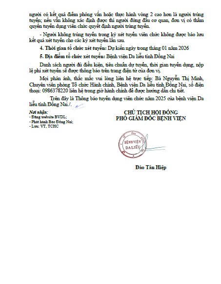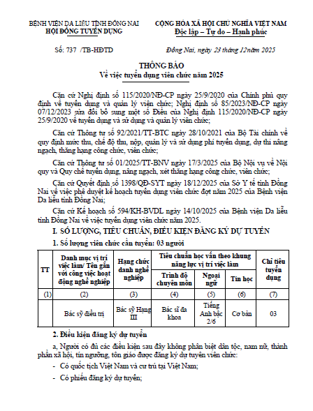 737.TB-HĐTD Thông báo tuyển dụng.pdf Bài liên quan Tuyển dụng (02.05.2023 02:33) 1 DỊCH VỤ NỔI BẬT Tiêm BAP - giải pháp trẻ hóa da an toàn, hiệu quả và hiện đại Tiêm Filler - Giải pháp làm đẹp an toàn, không phẫu thuật Nâng cơ mặt bằng máy RF – Trẻ hóa làn da an toàn Điều trị Laser nốt ruồi Điều trị các loại sẹo (lồi, lõm, xấu) hiệu quả Điều trị triệt lông bằng công nghệ IPL Điều trị nám - tàn nhang - bớt Ota - cafe Khám và điều trị các bệnh về da liễu TIN NỔI BẬT LỄ KỶ NIỆM 40 NĂM THÀNH LẬP BỆNH VIỆN DA LIỄU TỈNH ĐỒNG NAI SINH HOẠT ĐẦU KHOÁ LỚP THỰC HÀNH CHUYÊN KHOA DA LIỄU 9 THÁNG BỆNH VIỆN DA LIỄU TỈNH ĐỒNG NAI THỰC HIỆN XÉT NGHIỆM 64 DỊ NGUYÊN GÂY DỊ ỨNG Bệnh viện Da liễu Đồng Nai ký kết hợp tác với Trường Đại học Y Dược Cần Thơ Bệnh viện Da liễu Đồng Nai khai trương Phòng khám chuyên đề vảy nến Bệnh viện Da liễu Đồng Nai triển khai kỹ thuật cao trong chăm sóc, trẻ hóa da Bệnh viện Da liễu Đồng Nai thực hiện các dịch vụ làm đẹp an toàn, hiệu quả