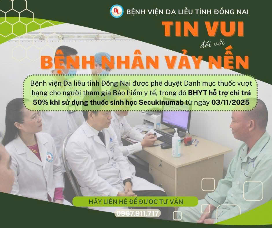 Nhân dịp kỷ niệm Ngày Vảy nến Thế giới 29/10, Bệnh viện Da Liễu tỉnh Đồng Nai trân trọng thông báo một tin vui đặc biệt, mở ra giai đoạn mới trong quản lý điều trị, nâng cao chất lượng cuộc sống, đồng thời giảm gánh nặng tài chính cho cộng đồng bệnh nhân Vảy nến trên địa bàn tỉnh Đồng Nai.