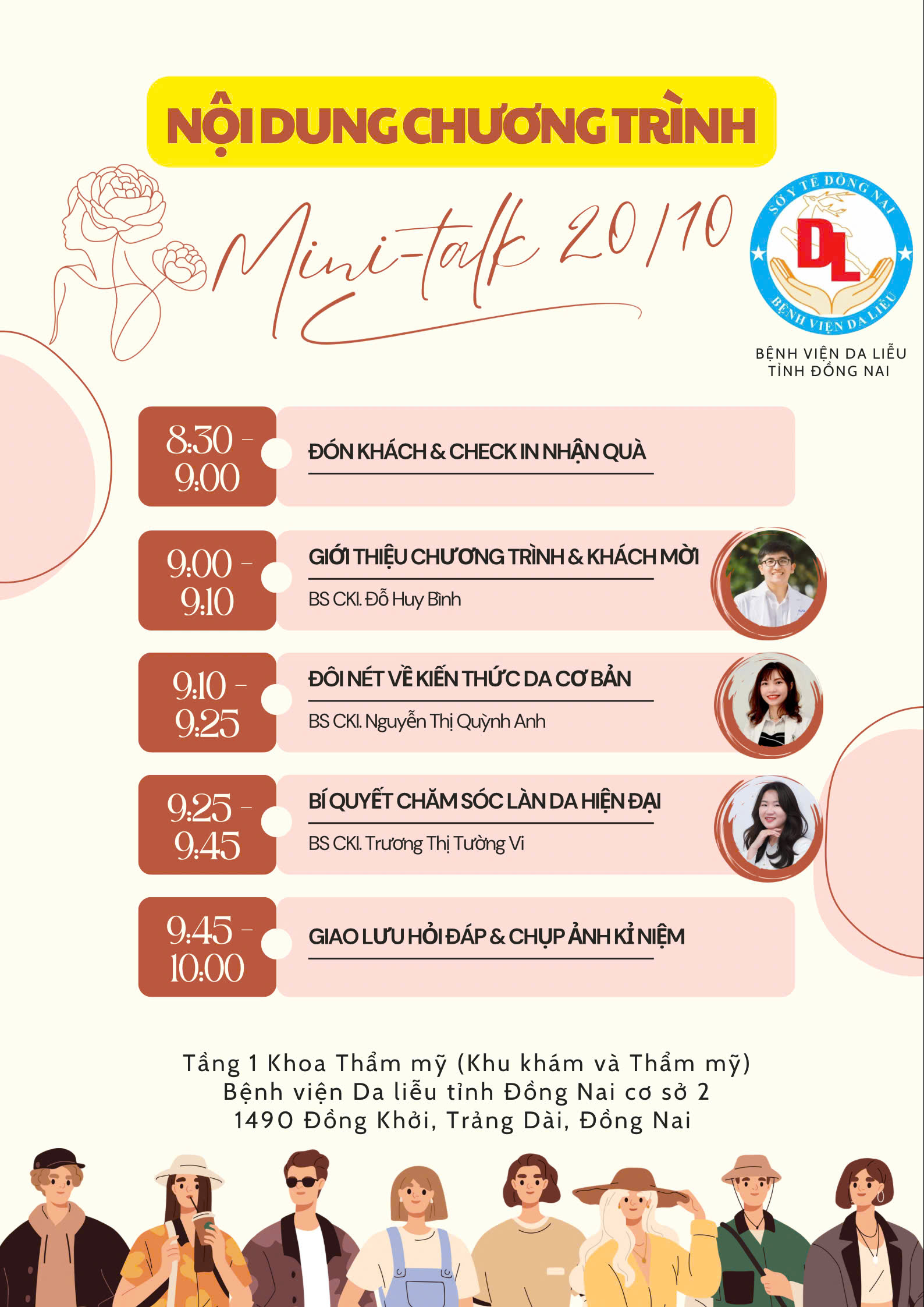 Hưởng ứng chương trình “Vì sức khoẻ làn da - Tiếp nối 40 năm niềm tin” và chào mừng Ngày Phụ nữ Việt Nam 20/10, Bệnh viện Da liễu Đồng Nai hân hoan tổ chức chương trình Mini-talk “Tỏa sáng vẻ đẹp – Trao gửi yêu thương” nhằm mang đến những kiến thức bổ ích về chăm sóc da cho chị em phụ nữ.