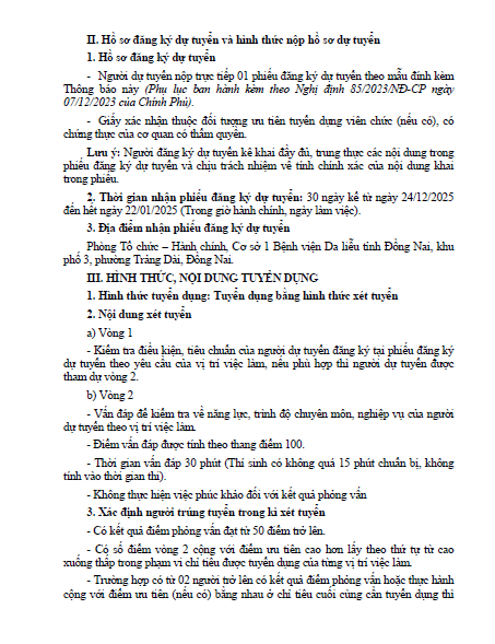 737.TB-HĐTD Thông báo tuyển dụng.pdf Bài liên quan Tuyển dụng (02.05.2023 02:33) 1 DỊCH VỤ NỔI BẬT Tiêm BAP - giải pháp trẻ hóa da an toàn, hiệu quả và hiện đại Tiêm Filler - Giải pháp làm đẹp an toàn, không phẫu thuật Nâng cơ mặt bằng máy RF – Trẻ hóa làn da an toàn Điều trị Laser nốt ruồi Điều trị các loại sẹo (lồi, lõm, xấu) hiệu quả Điều trị triệt lông bằng công nghệ IPL Điều trị nám - tàn nhang - bớt Ota - cafe Khám và điều trị các bệnh về da liễu TIN NỔI BẬT LỄ KỶ NIỆM 40 NĂM THÀNH LẬP BỆNH VIỆN DA LIỄU TỈNH ĐỒNG NAI SINH HOẠT ĐẦU KHOÁ LỚP THỰC HÀNH CHUYÊN KHOA DA LIỄU 9 THÁNG BỆNH VIỆN DA LIỄU TỈNH ĐỒNG NAI THỰC HIỆN XÉT NGHIỆM 64 DỊ NGUYÊN GÂY DỊ ỨNG Bệnh viện Da liễu Đồng Nai ký kết hợp tác với Trường Đại học Y Dược Cần Thơ Bệnh viện Da liễu Đồng Nai khai trương Phòng khám chuyên đề vảy nến Bệnh viện Da liễu Đồng Nai triển khai kỹ thuật cao trong chăm sóc, trẻ hóa da Bệnh viện Da liễu Đồng Nai thực hiện các dịch vụ làm đẹp an toàn, hiệu quả
